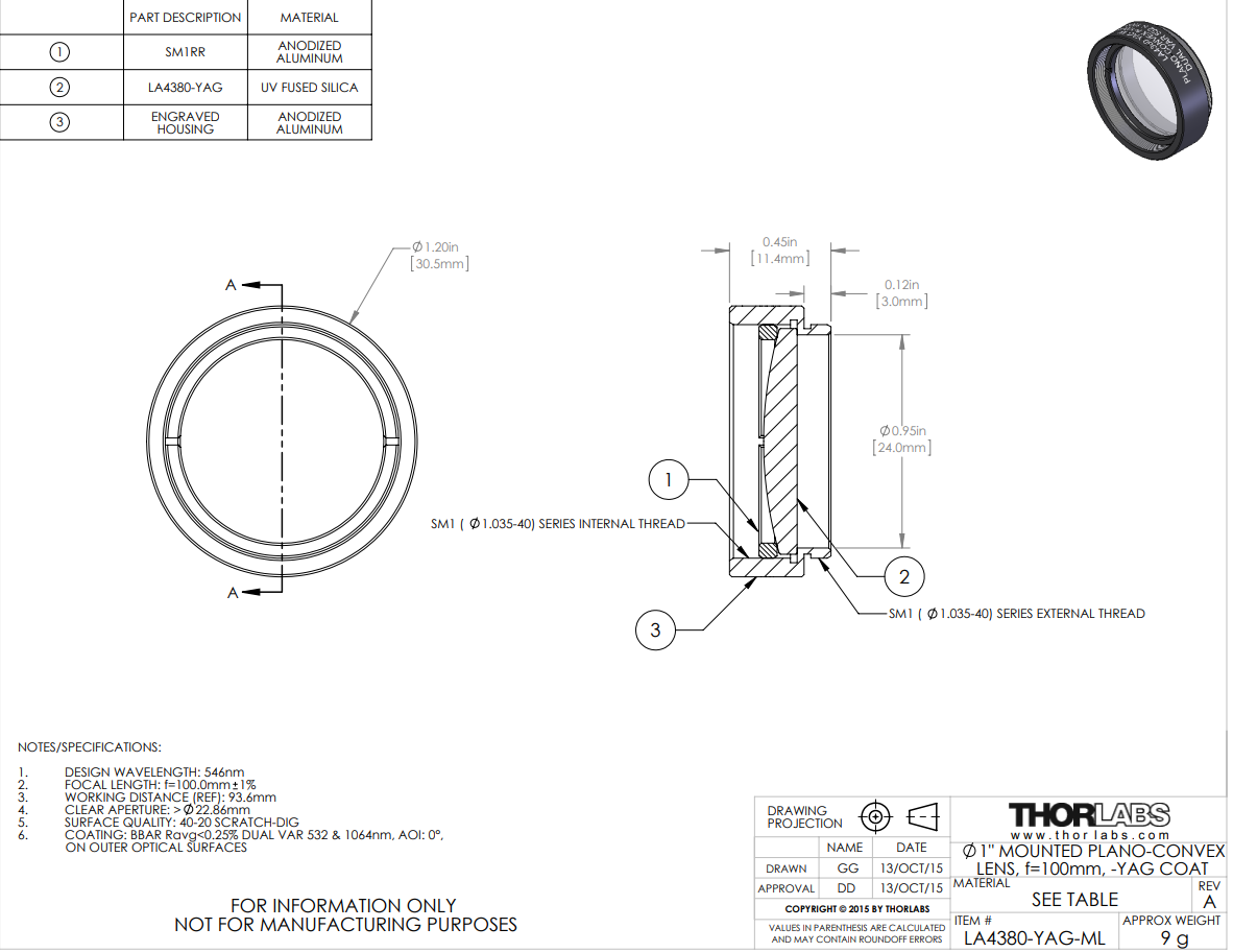Thorlabs索雷博 LA4380-YAG-ML 紫外熔融石英平凸球透镜