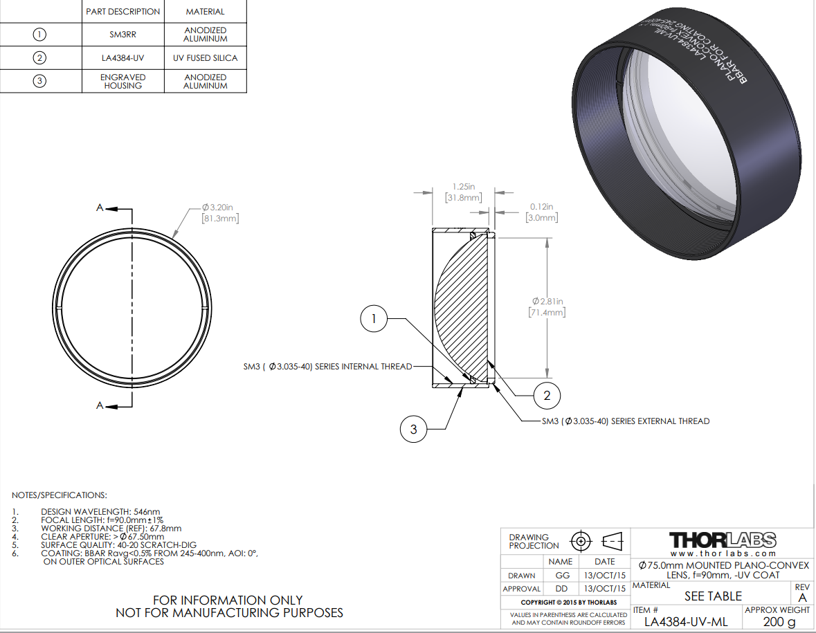 透镜直径 | Ø1/2" 螺纹安装座(SM05螺纹规格) (0.535"-40) SM1-螺纹接口中的"Ø1" (1.035"-40) SM2螺纹安装中的Ø2 (2.035"-40) Ø75毫米 SM3螺纹接口 (3.035"-40) |