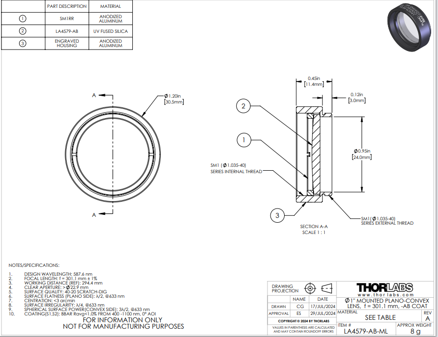 Thorlabs索雷博 LA4579-AB-ML 紫外熔融石英平凸球透镜