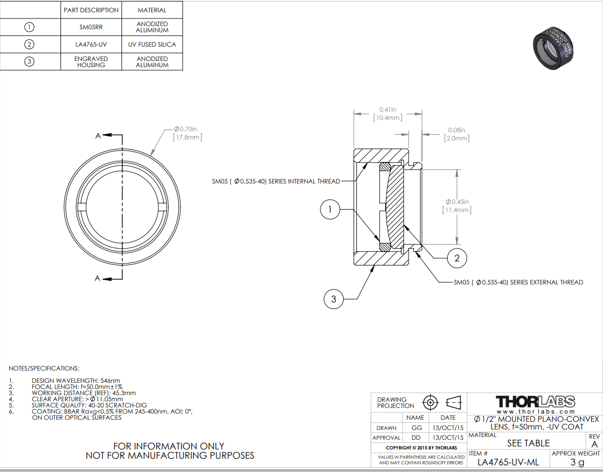 透镜直径 | Ø1/2" 螺纹安装座(SM05螺纹规格) (0.535"-40) SM1-螺纹接口中的"Ø1" (1.035"-40) SM2螺纹安装中的Ø2 (2.035"-40) Ø75毫米 SM3螺纹接口 (3.035"-40) |