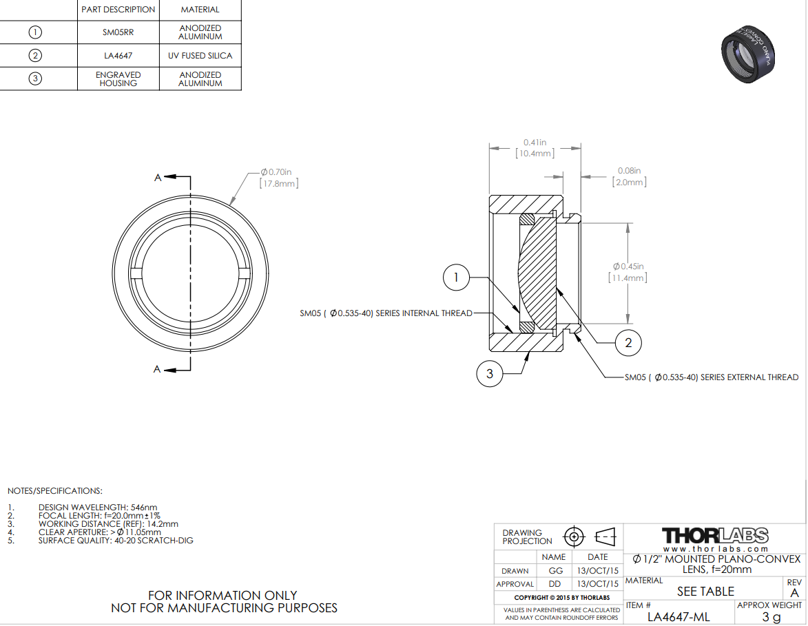 Thorlabs索雷博 LA4647-ML 平凸透镜