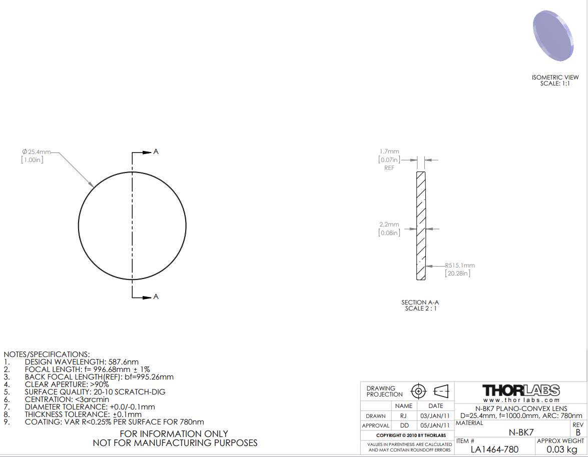 为了最小化引入的球差,在聚焦准直光束时应使其入射到透镜曲面上,而在准直点光源发出的光束时应使其入射到透镜平面上。透镜焦距可用厚透镜简化公式 f=R/(n-1)计算,其中n是折射率,R是透镜凸面曲率半径。这种透镜采用N-BK7玻璃制造,阿贝数为64.17。阿贝数表征的是色散的大小。