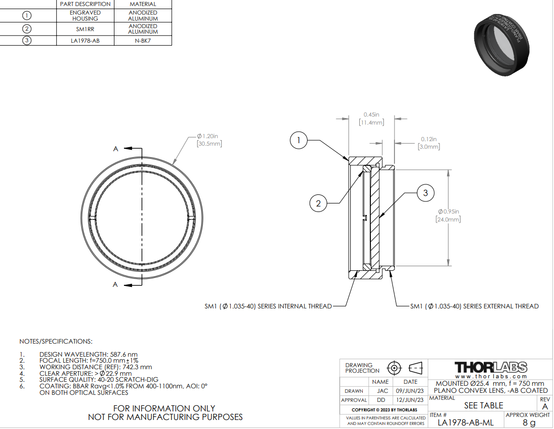 Thorlabs索雷博 LA1978-AB-ML 平凸透镜