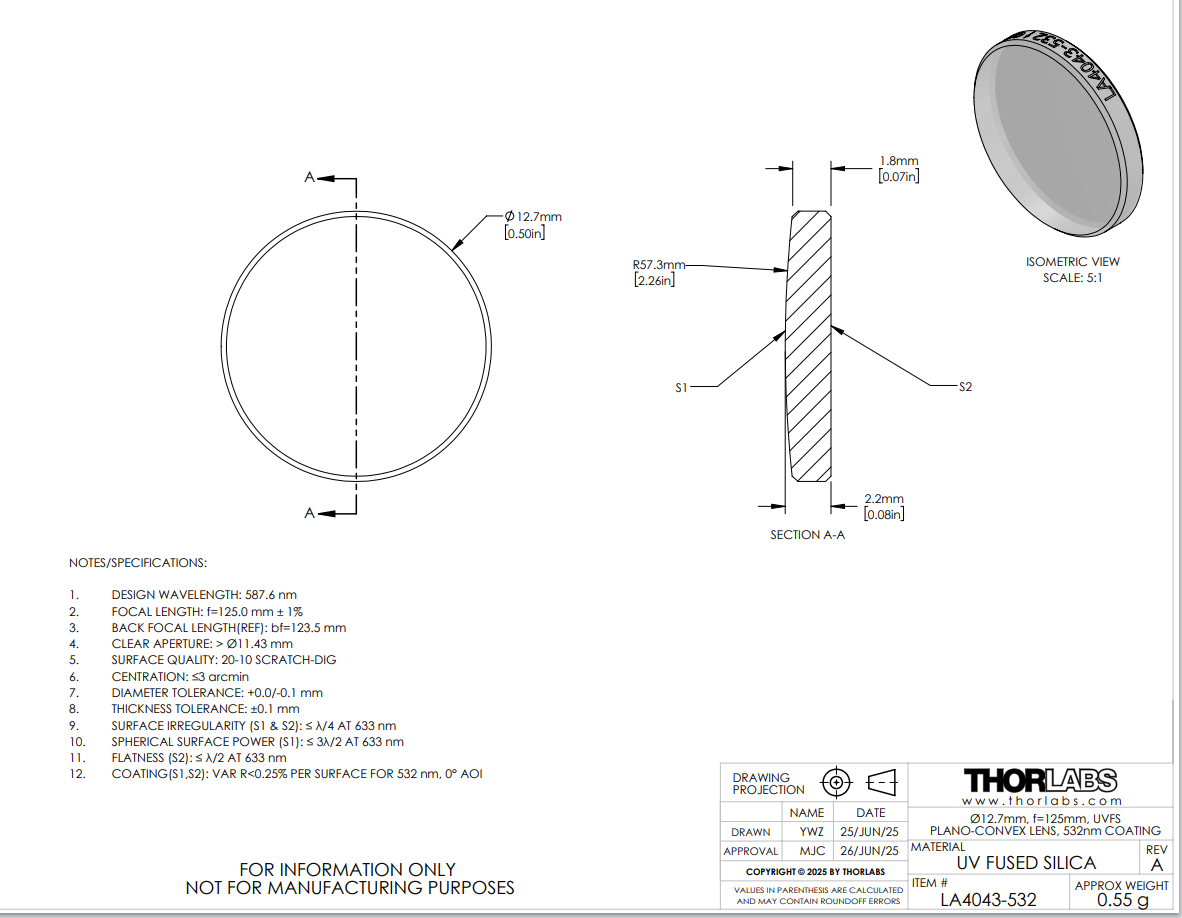 Thorlabs索雷博 LA4043-532 紫外熔融石英平凸球透镜