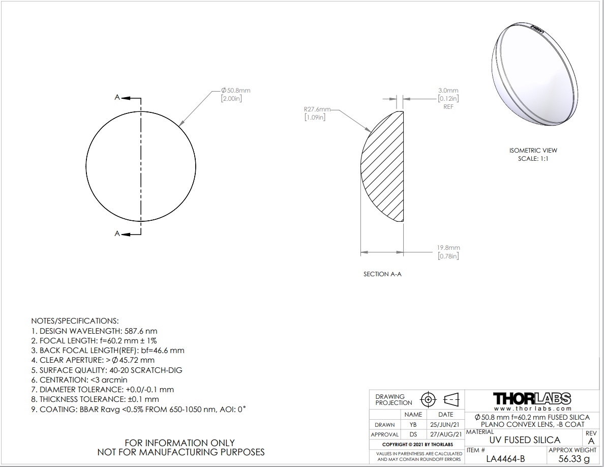 Thorlabs索雷博 LA4464-B 紫外熔融石英平凸球透镜