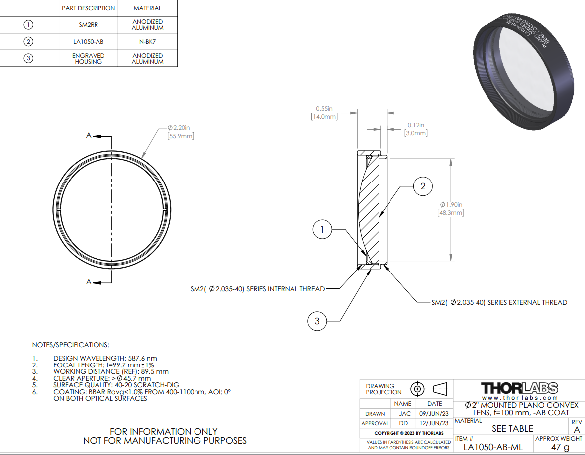 这些平凸透镜由符合RoHS标准的N-BK7材料制成,且镀有增透(AR)膜,在400 nm - 1100 nm波长范围内提供每个表面< 1.0%的平均反射率。N-BK7通常用于不需要紫外熔融石英的高级性能(如在紫外波段的高透过率和较低的热膨胀系数)的应用场合。这些Ø1/2英寸、Ø1英寸、Ø1.5英寸和Ø2英寸的透镜分别安装在兼容SM05(0.535"-40)、SM1(1.035"-40)、SM1.5 (1.535"-40)和SM2(2.035"-40)螺纹的安装座中,从而兼容我们的SM螺纹透镜套筒。SM螺纹卡环用于将透镜固定在安装座中。每个安装座都刻有产品型号、透镜类型、焦距、指向透镜曲面的箭头以及增透膜范围。