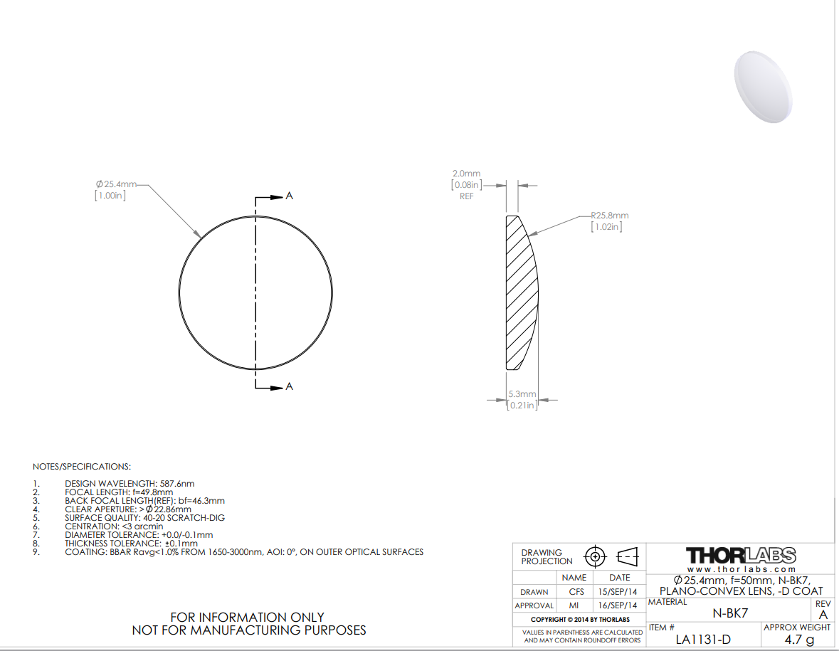 Thorlabs索雷博 LA1131-D 平凸透镜