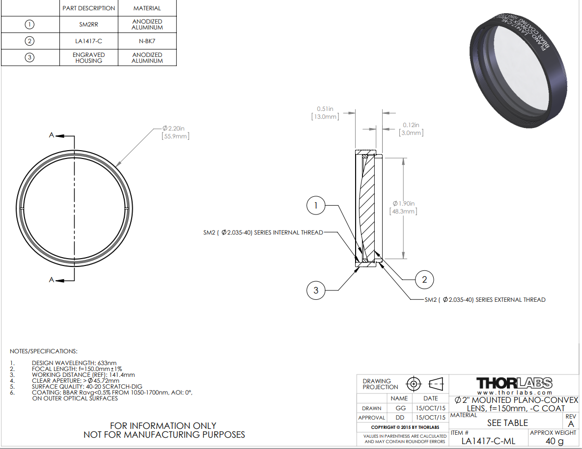 这些平凸透镜由N-BK7材料制造,它是符合RoHS标准的BK7玻璃,并且镀有增透膜,在1050 - 1620 nm或1050 - 1700 nm波长范围上提供每个表面< 0.5%的平均反射率。N-BK7是制造高性能光学元件最广泛使用的光学玻璃之一。当紫外熔融石英的额外好处(即良好的紫外透过率和较低的热膨胀系数)不那么必要时,通常会选择该材料。这些Ø1/2英寸、Ø1英寸、Ø1.5英寸和Ø2英寸的透镜分别安装在兼容SM05-(0.535"-40)、SM1-(1.035"-40)、SM1.5(1.535"-40)和SM2-(2.035"-40)螺纹的安装座上,从而兼容我们的SM螺纹透镜套管。每个透镜套筒都刻有型号,透镜类型,焦距和指向透镜弯曲表面的箭头,以及增透膜范围。