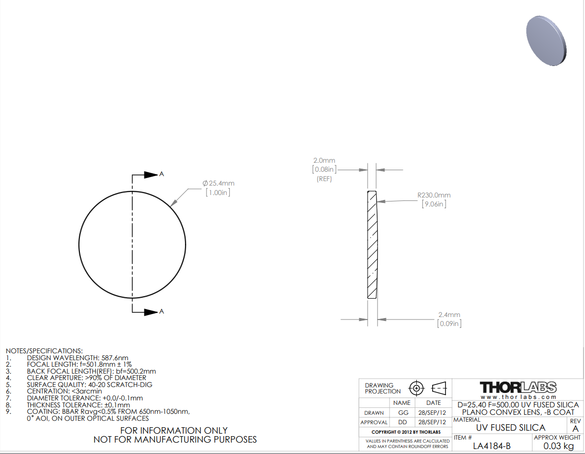 Thorlabs索雷博 LA4184-B 紫外熔融石英平凸球透镜