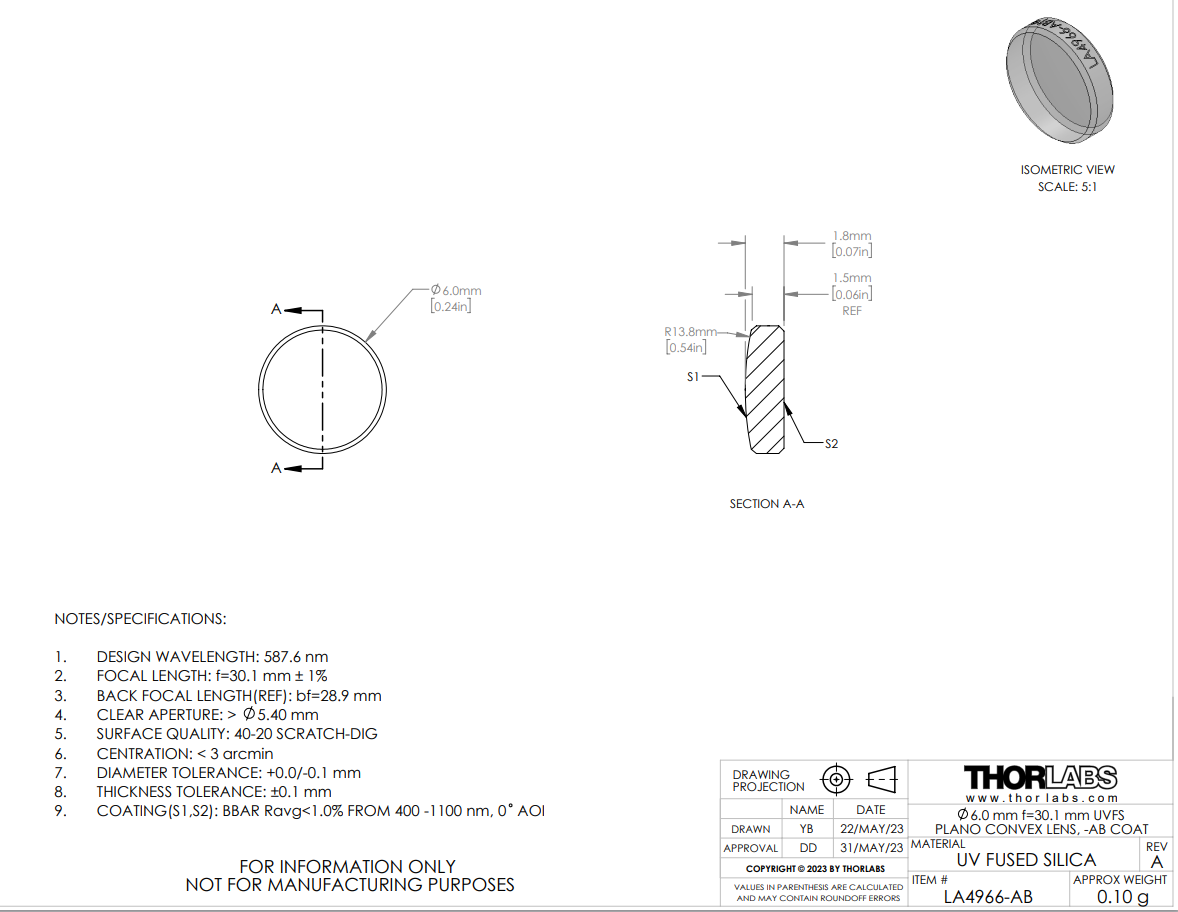 Thorlabs索雷博 LA4966-AB 紫外熔融石英平凸球透镜