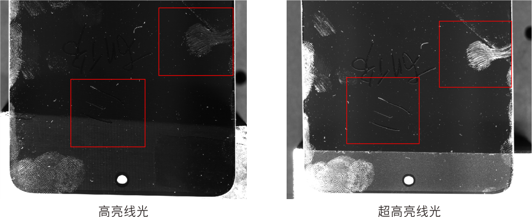 超高亮线光与高亮线光成像对比(相同光源角度与相机曝光参数下)