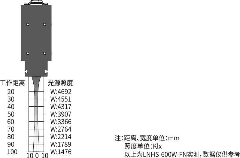 调光为100%时,工作距离50mm时的理论值,实际数值可能存在出入