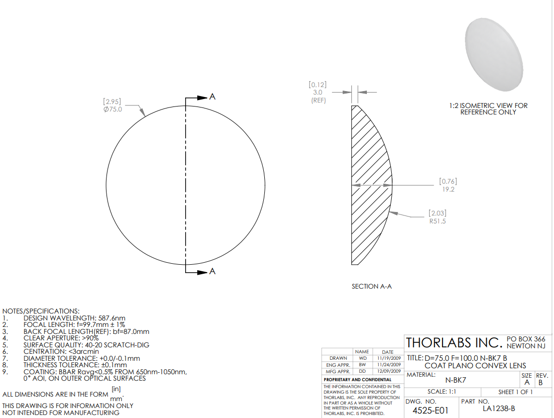 Thorlabs索雷博 LA1238-B 平凸透镜