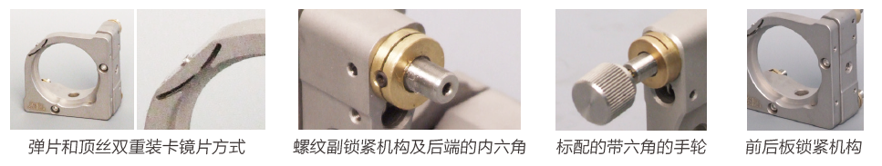 • 精密调整:采用三个0.2mm螺距的精研螺纹副(除12.7镜架外)进行三维调节,螺纹副带独特的锁紧机构,有效提高稳定性及灵敏度;