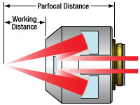 图G1.1 上图展现了具有无限远后焦距的反射型物镜的工作距离和齐焦距离。