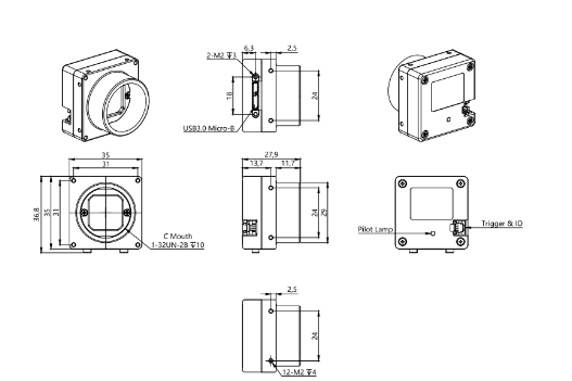 35x36.8x27.9mm (为C接口尺寸,不含镜头底座和后壳接口)