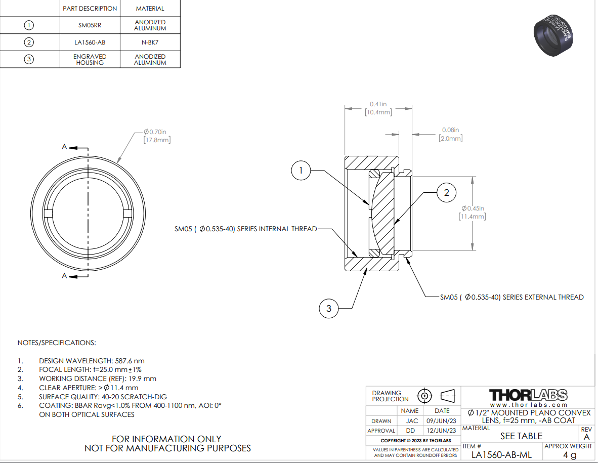 这些平凸透镜由符合RoHS标准的N-BK7材料制成,且镀有增透(AR)膜,在400 nm - 1100 nm波长范围内提供每个表面< 1.0%的平均反射率。N-BK7通常用于不需要紫外熔融石英的高级性能(如在紫外波段的高透过率和较低的热膨胀系数)的应用场合。这些Ø1/2英寸、Ø1英寸、Ø1.5英寸和Ø2英寸的透镜分别安装在兼容SM05(0.535"-40)、SM1(1.035"-40)、SM1.5 (1.535"-40)和SM2(2.035"-40)螺纹的安装座中,从而兼容我们的SM螺纹透镜套筒。SM螺纹卡环用于将透镜固定在安装座中。每个安装座都刻有产品型号、透镜类型、焦距、指向透镜曲面的箭头以及增透膜范围。