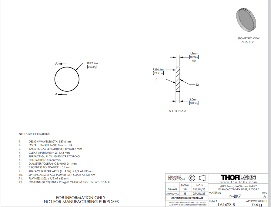其中n是折射率,R是透镜表面的曲率半径。这些透镜使用阿贝数为64.17的N-BK7材料生产;阿贝数是色散指标。