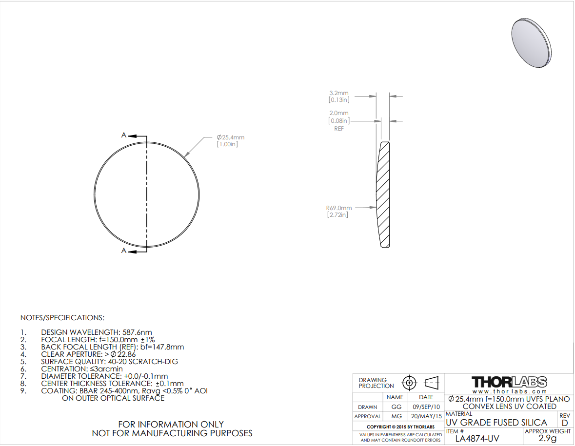 Thorlabs索雷博 LA4874-UV 平凸透镜