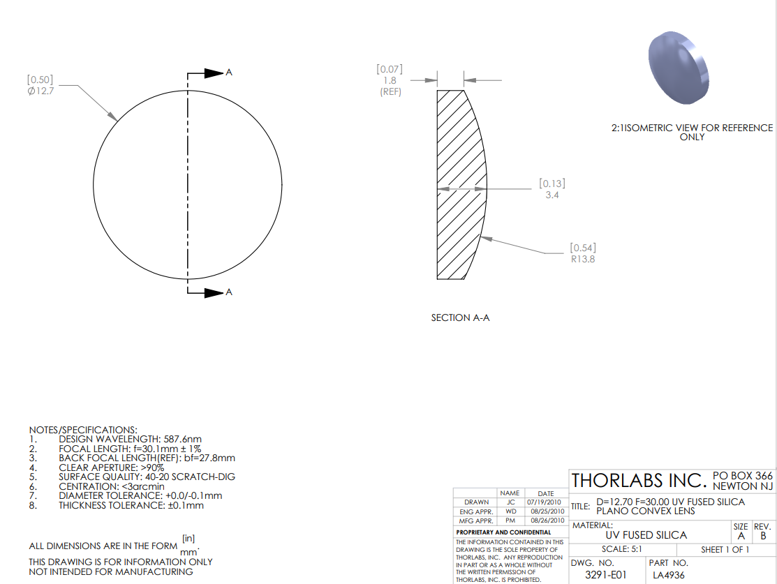 其中,n是折射率,R是透镜表面的曲率半径。这些透镜由阿贝数为67.82的紫外级熔融石英制成;阿贝数是色散指标。