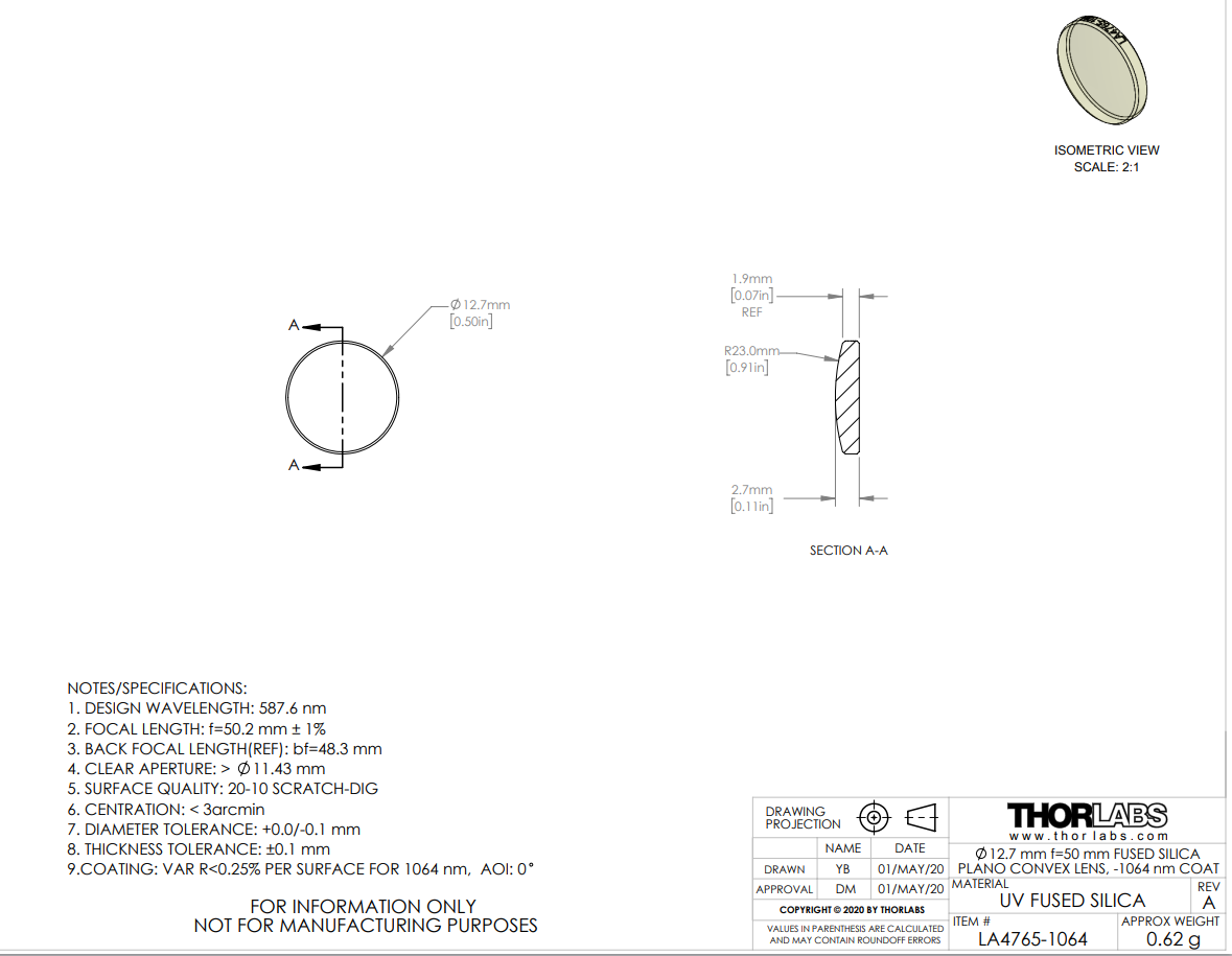 Thorlabs索雷博 LA4765-1064 紫外熔融石英平凸球透镜