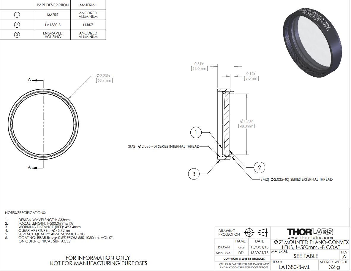 这些平凸透镜由N-BK7材料制造,它是符合RoHS标准的BK7玻璃,并且镀有增透膜,在650 - 1050 nm波长范围上提供每个表面< 0.5%的平均反射率。N-BK7是制造高性能光学元件最广泛使用的光学玻璃之一。当紫外熔融石英的额外好处(即良好的紫外透过率和较低的热膨胀系数)不那么必要时,通常会选择该材料。这些Ø1/2英寸,Ø1英寸、Ø1.5英寸和Ø2英寸的透镜分别安装在兼容SM05 -(0.535"-40),SM1-(1.035"-40)、SM1.5(1.535"-40)和SM2-(2.035"-40)螺纹的安装座上,从而兼容我们的SM螺纹透镜套管。每个透镜套筒都刻有型号,透镜类型,焦距和指向透镜弯曲表面的箭头,以及增透膜范围。