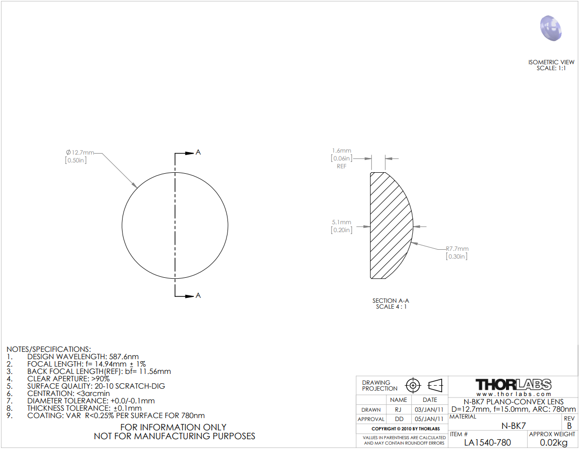Thorlabs索雷博 LA1540-780 平凸透镜