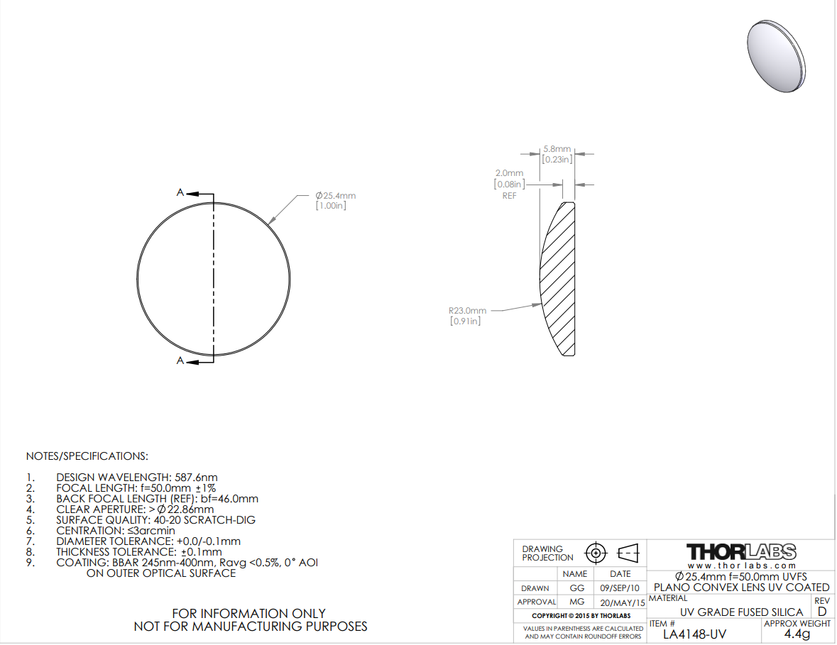 Thorlabs索雷博 LA4148-UV 平凸透镜