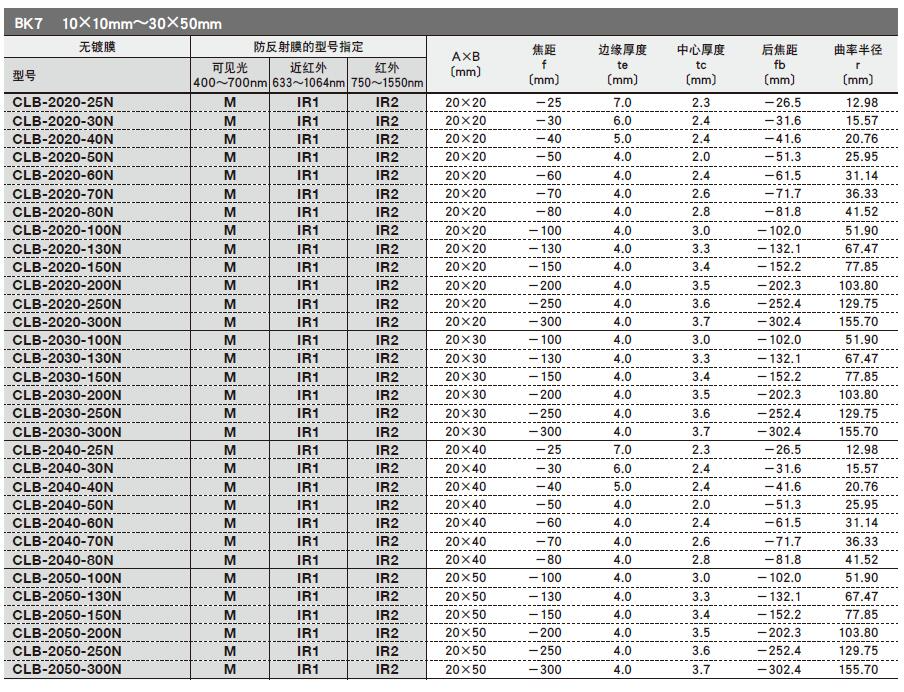 OLBCY2020-50 | K9玻璃,平凹柱面透镜 | 20×20 | -50 | 4 |