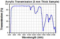上图曲线表示未镀膜丙烯酸的总透过率,包括表面反射。我们的CAY046-A塑料非球面透镜使用丙烯酸制造,然后在表面镀400到700 nm范围的增透膜。