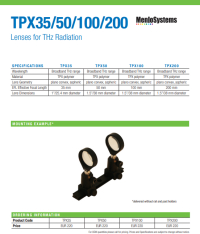 TPX35是一款Ø1英寸透镜,有效焦距(EFL)为35 mm,设计用于高度发散的太赫兹辐射准直。TPX50是一款Ø1.5英寸透镜,EFL为50 mm,具有与TPX35相同的数值孔径。TPX35和TPX50经过优化,适用于Menlo Systems的TERA15-FC天线系列。
