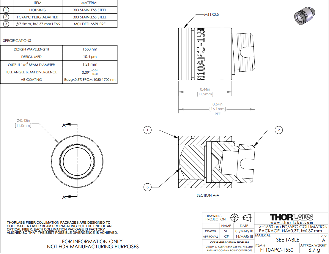Thorlabs索雷博 F110APC-1550 光纤准直器