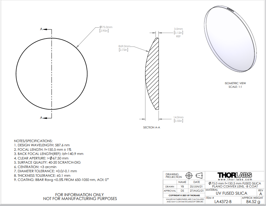 Thorlabs索雷博 LA4372-B 紫外熔融石英平凸球透镜