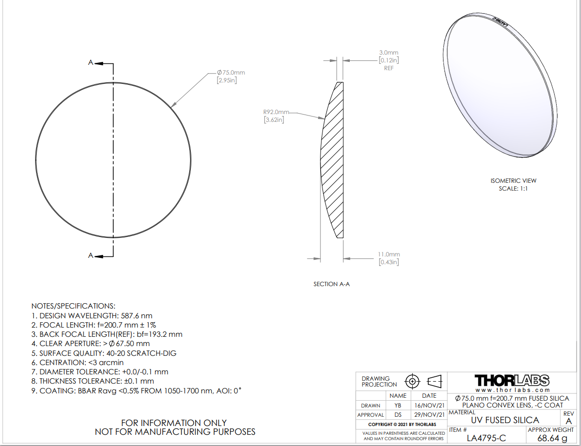 Thorlabs索雷博 LA4795-C 紫外熔融石英平凸球透镜