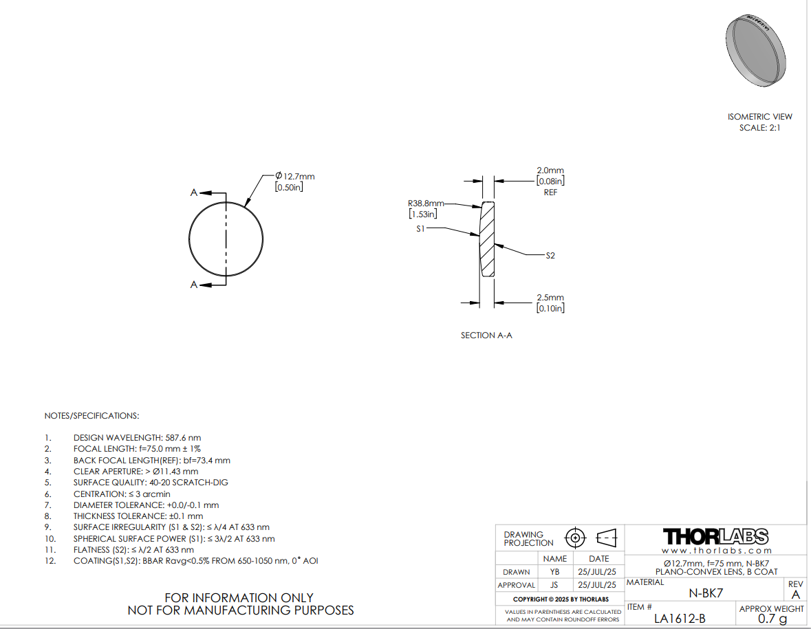 其中n是折射率,R是透镜表面的曲率半径。这些透镜使用阿贝数为64.17的N-BK7材料生产;阿贝数是色散指标。