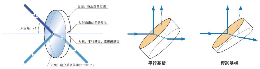 · 由于是平板型半反射镜,透过基板时产生的波长分散或色差很小,重量也可以减轻。