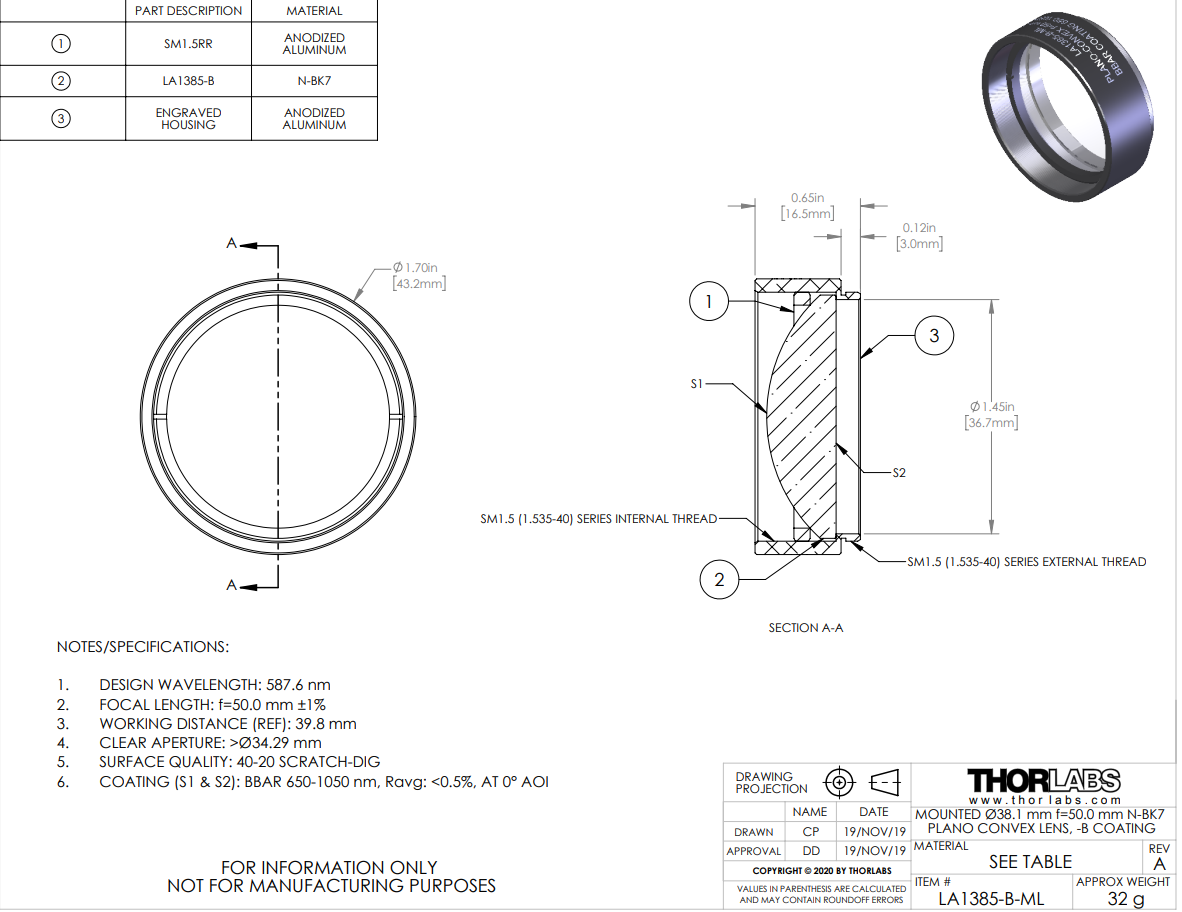 这些平凸透镜由N-BK7材料制造,它是符合RoHS标准的BK7玻璃,并且镀有增透膜,在650 - 1050 nm波长范围上提供每个表面< 0.5%的平均反射率。N-BK7是制造高性能光学元件最广泛使用的光学玻璃之一。当紫外熔融石英的额外好处(即良好的紫外透过率和较低的热膨胀系数)不那么必要时,通常会选择该材料。这些Ø1/2英寸,Ø1英寸、Ø1.5英寸和Ø2英寸的透镜分别安装在兼容SM05 -(0.535"-40),SM1-(1.035"-40)、SM1.5(1.535"-40)和SM2-(2.035"-40)螺纹的安装座上,从而兼容我们的SM螺纹透镜套管。每个透镜套筒都刻有型号,透镜类型,焦距和指向透镜弯曲表面的箭头,以及增透膜范围。