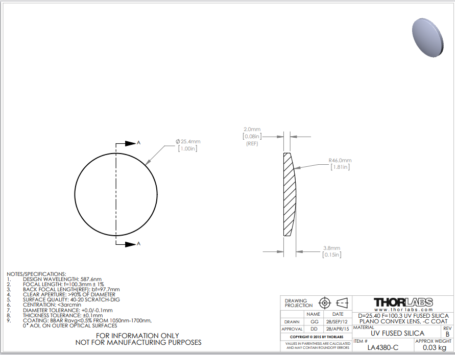 Thorlabs索雷博 LA4380-C 紫外熔融石英平凸球透镜