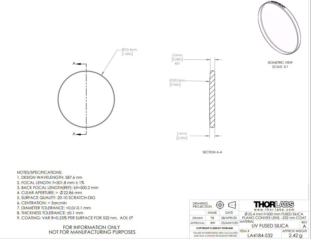 Thorlabs索雷博 LA4184-532 紫外熔融石英平凸球透镜