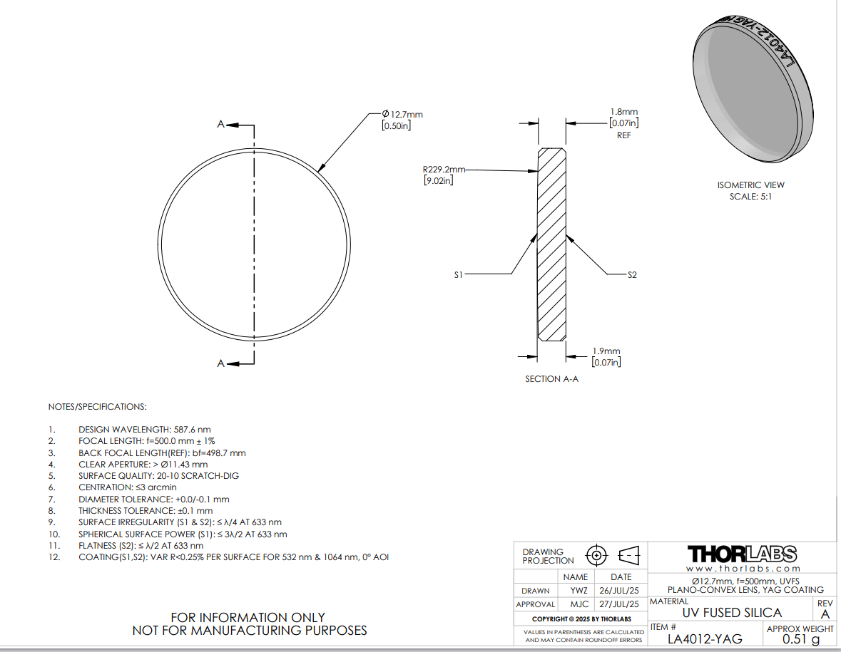 Thorlabs索雷博 LA4012-YAG 紫外熔融石英平凸球透镜
