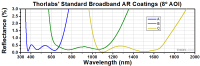 这些高性能的多层增透膜在指定波长范围上平均反射率小于0.5%(每个表面),且在0°到30°的入射角范围内提供良好性能(0.5 NA)。下方所示的图为本系列产品标准镀膜的性能随波长变化的曲线。宽带镀膜的典型吸收率为0.25%,它不显示在反射率曲线中。