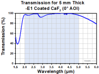 上图为0° AOI下镀E1增透膜的5 mm CaF2基底测量透过率和波长之间的函数关系图。蓝色阴影区域表示增透膜优化的区域。指定范围外的性能不能保证,而且不同批次产品性能会有差异。上面的excel文件提供了延伸波长范围上的镀膜曲线数据。