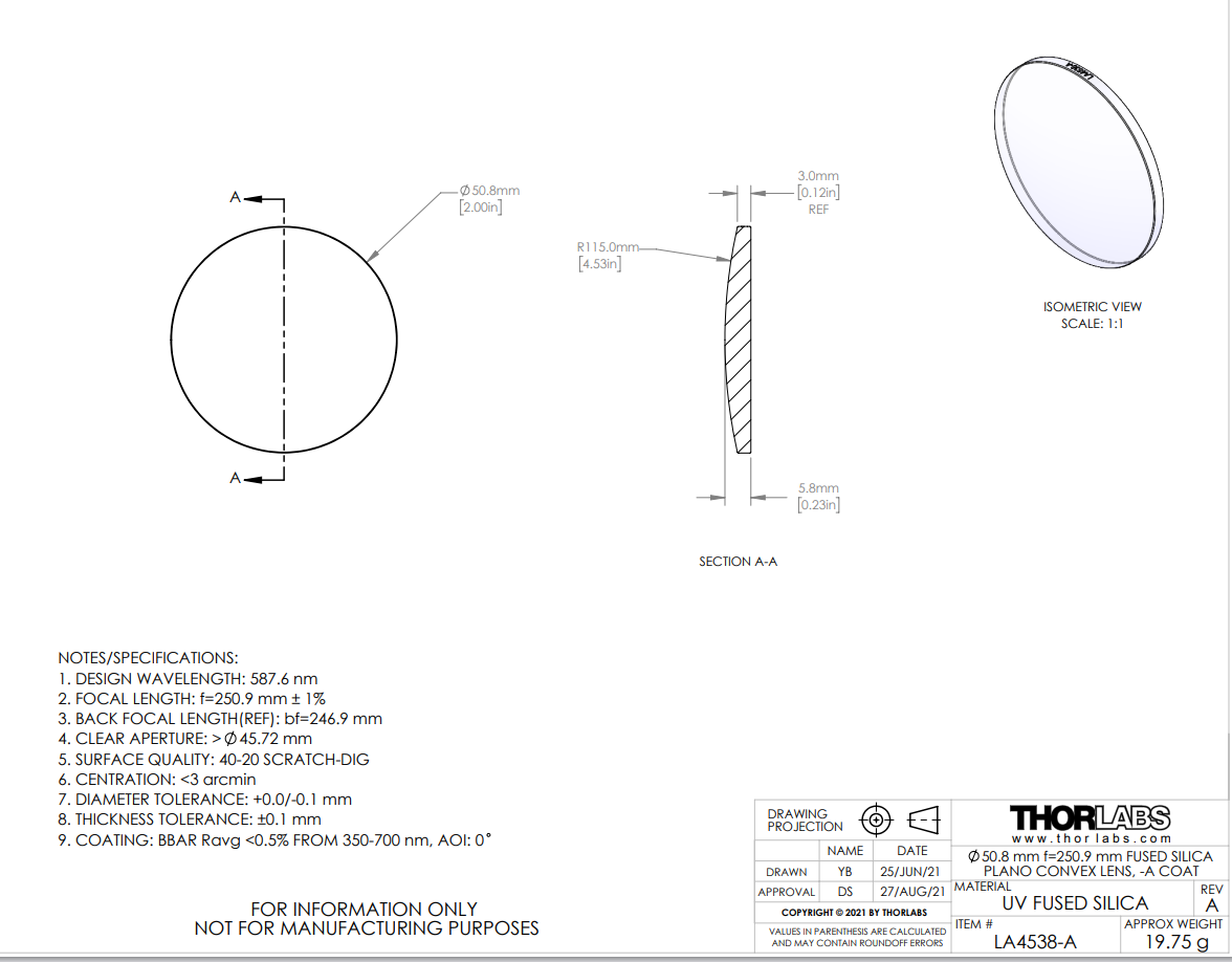 Thorlabs索雷博 LA4538-A 平凸透镜