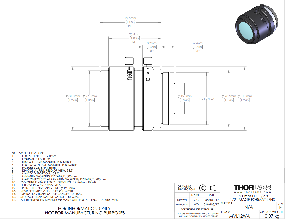 Thorlabs索雷博 MVL12WA 定焦镜头