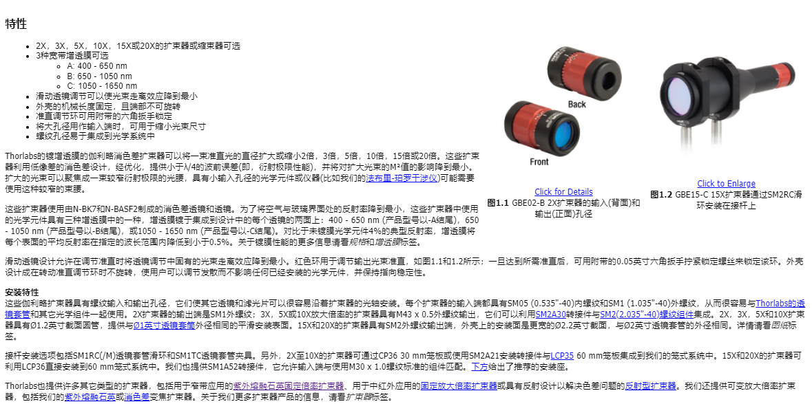 Thorlabs索雷博 GBE10-B 消色差伽利略扩束器
