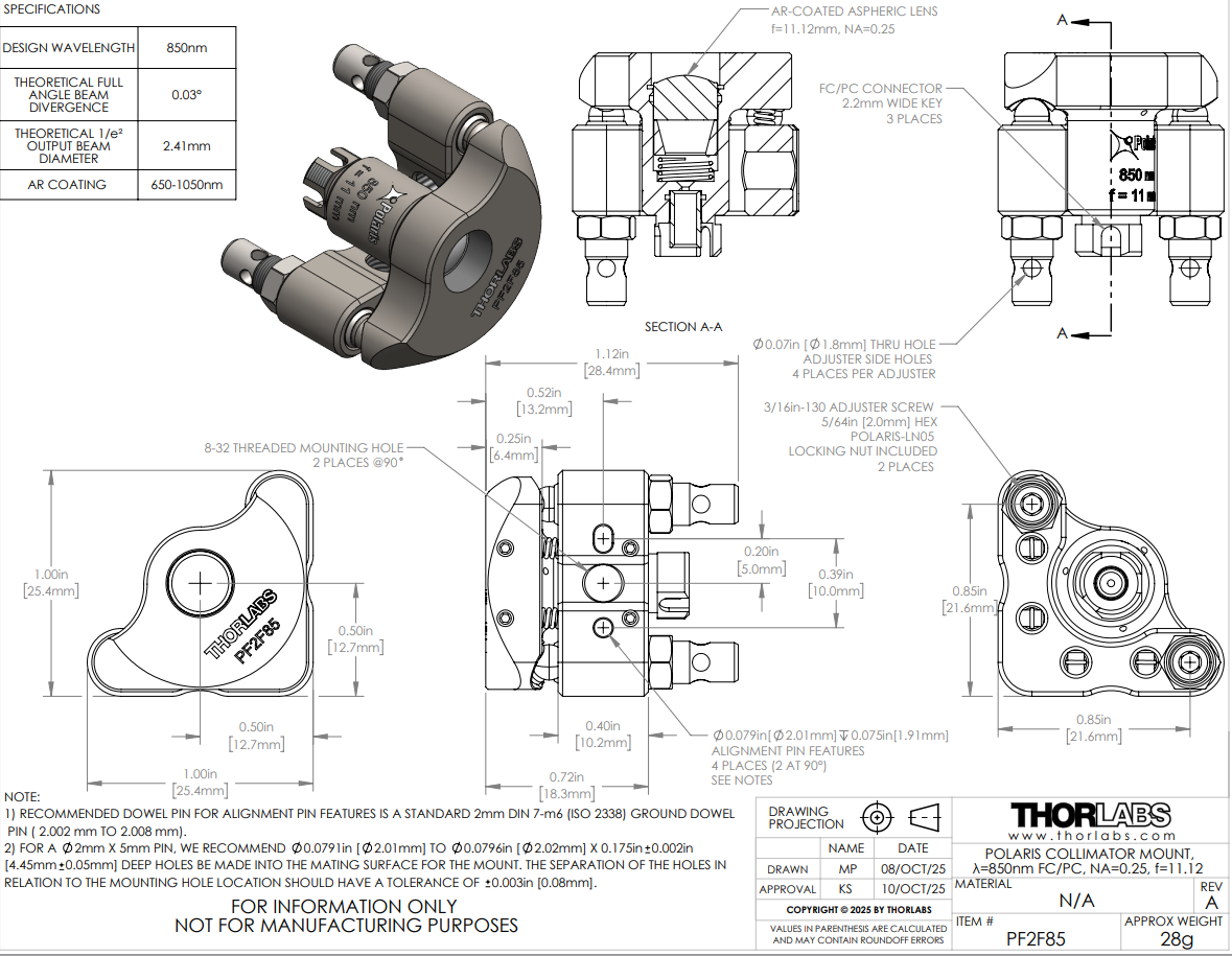 PF2F85 - Polaris®可调、定焦准直器,850 nm,FC/PC,8-32螺纹