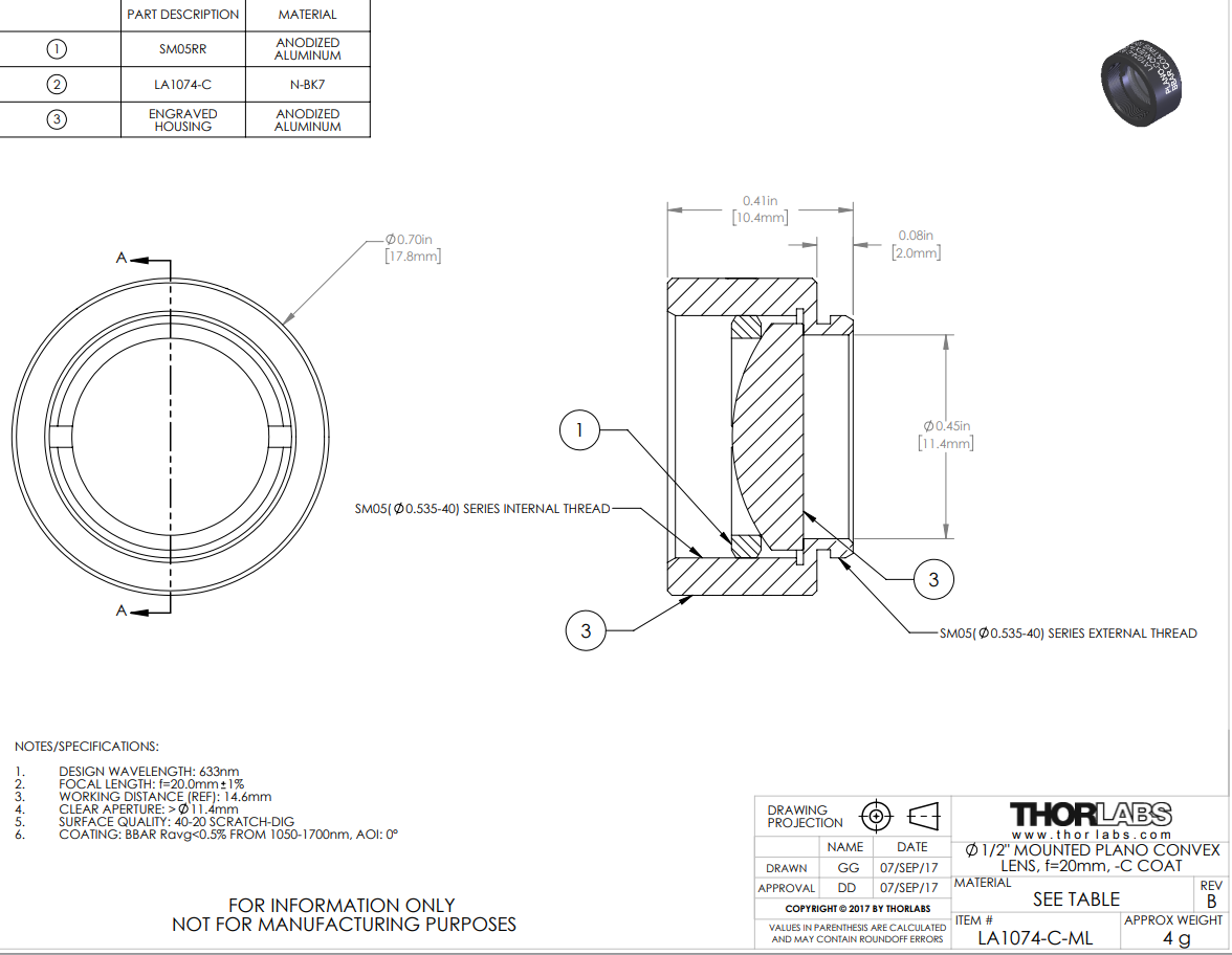 这些平凸透镜由N-BK7材料制造,它是符合RoHS标准的BK7玻璃,并且镀有增透膜,在1050 - 1620 nm或1050 - 1700 nm波长范围上提供每个表面< 0.5%的平均反射率。N-BK7是制造高性能光学元件最广泛使用的光学玻璃之一。当紫外熔融石英的额外好处(即良好的紫外透过率和较低的热膨胀系数)不那么必要时,通常会选择该材料。这些Ø1/2英寸、Ø1英寸、Ø1.5英寸和Ø2英寸的透镜分别安装在兼容SM05-(0.535"-40)、SM1-(1.035"-40)、SM1.5(1.535"-40)和SM2-(2.035"-40)螺纹的安装座上,从而兼容我们的SM螺纹透镜套管。每个透镜套筒都刻有型号,透镜类型,焦距和指向透镜弯曲表面的箭头,以及增透膜范围。