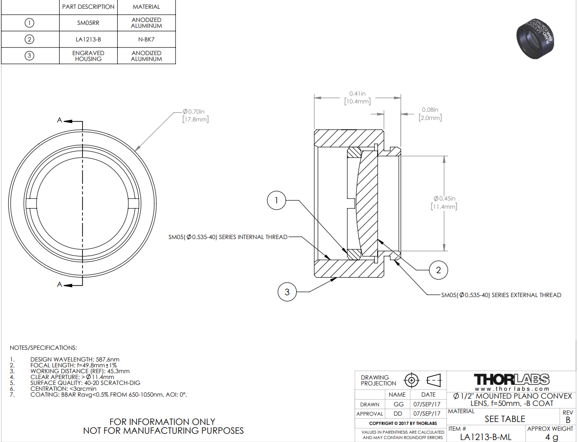 这些平凸透镜由N-BK7材料制造,它是符合RoHS标准的BK7玻璃,并且镀有增透膜,在650 - 1050 nm波长范围上提供每个表面< 0.5%的平均反射率。N-BK7是制造高性能光学元件最广泛使用的光学玻璃之一。当紫外熔融石英的额外好处(即良好的紫外透过率和较低的热膨胀系数)不那么必要时,通常会选择该材料。这些Ø1/2英寸,Ø1英寸、Ø1.5英寸和Ø2英寸的透镜分别安装在兼容SM05 -(0.535"-40),SM1-(1.035"-40)、SM1.5(1.535"-40)和SM2-(2.035"-40)螺纹的安装座上,从而兼容我们的SM螺纹透镜套管。每个透镜套筒都刻有型号,透镜类型,焦距和指向透镜弯曲表面的箭头,以及增透膜范围。