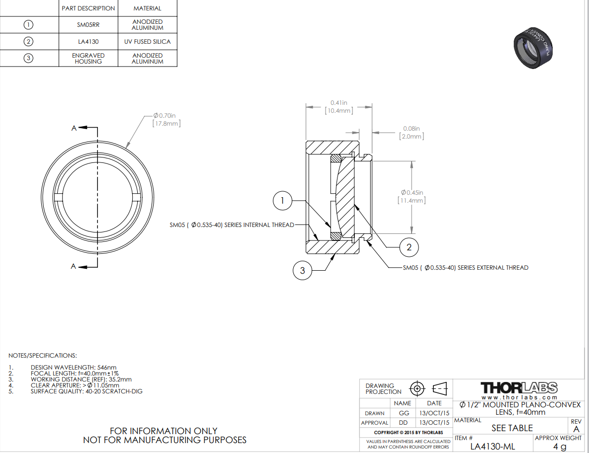 Thorlabs索雷博 LA4130-ML 平凸透镜