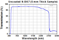 图2.1:上方是入射光正入射到表面时,10 mm厚未镀膜N-BK7样品的透过率曲线图。请注意,这是测量的透过率,包含表面反射。